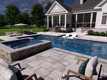 This design features a serene backyard oasis complete with a sparkling pool, cozy fire feature, and convenient outdoor kitchen.